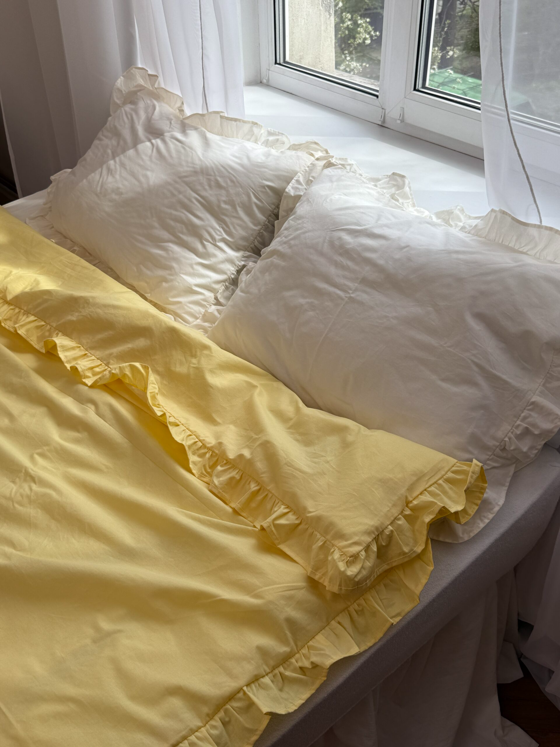 Ніжна постільна білизна кольору «лимонний тарт» з рюшами — це ідеальне поєднання свіжості, комфорту та ручної роботи. Комплект виготовлений із турецького ранфорсу — 100% натуральної бавовни, що забезпечує комфортний сон у будь-яку пору року.